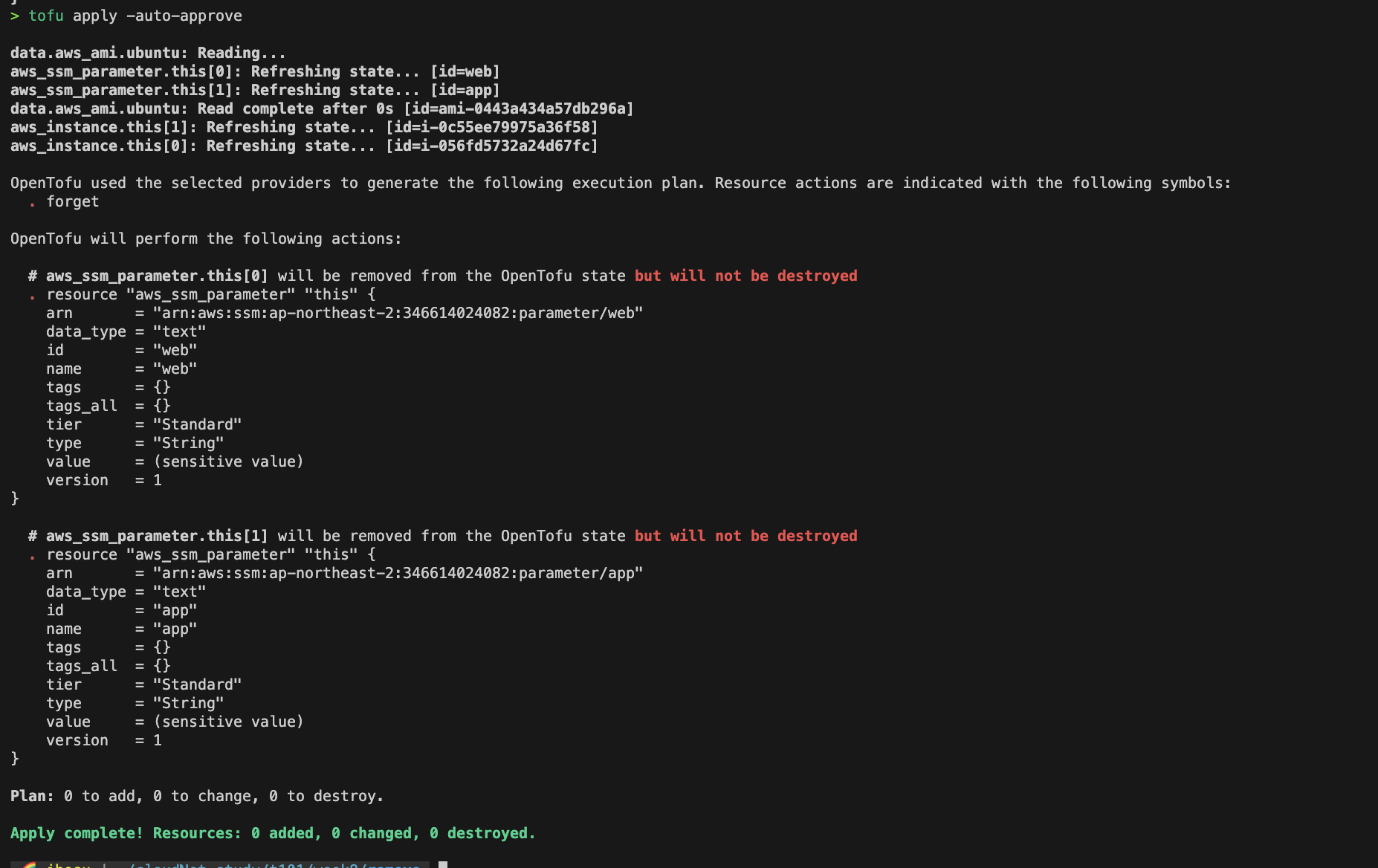 출력되는 메시지를 살펴보면 aws_ssm_parameter.this[0],aws_ssm_parameter.this[1]을 state 파일에서 제거했지만 실제 대상에서는 삭제되지 않았음을 알려줍니다.