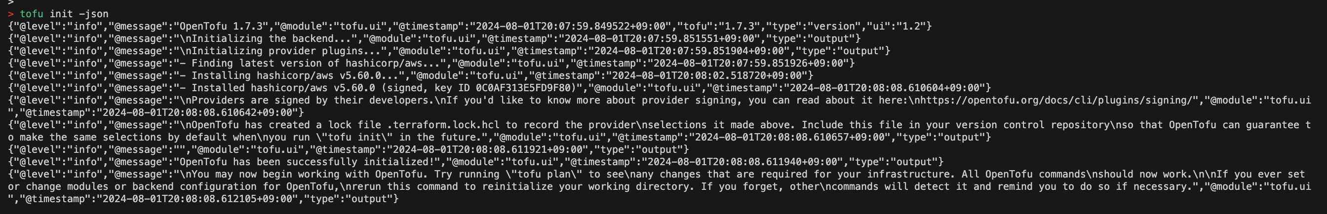tofu init에 json 형태의 출력을 지원하기 때문에 해당 옵션을 붙여 명령어를 실행합니다.