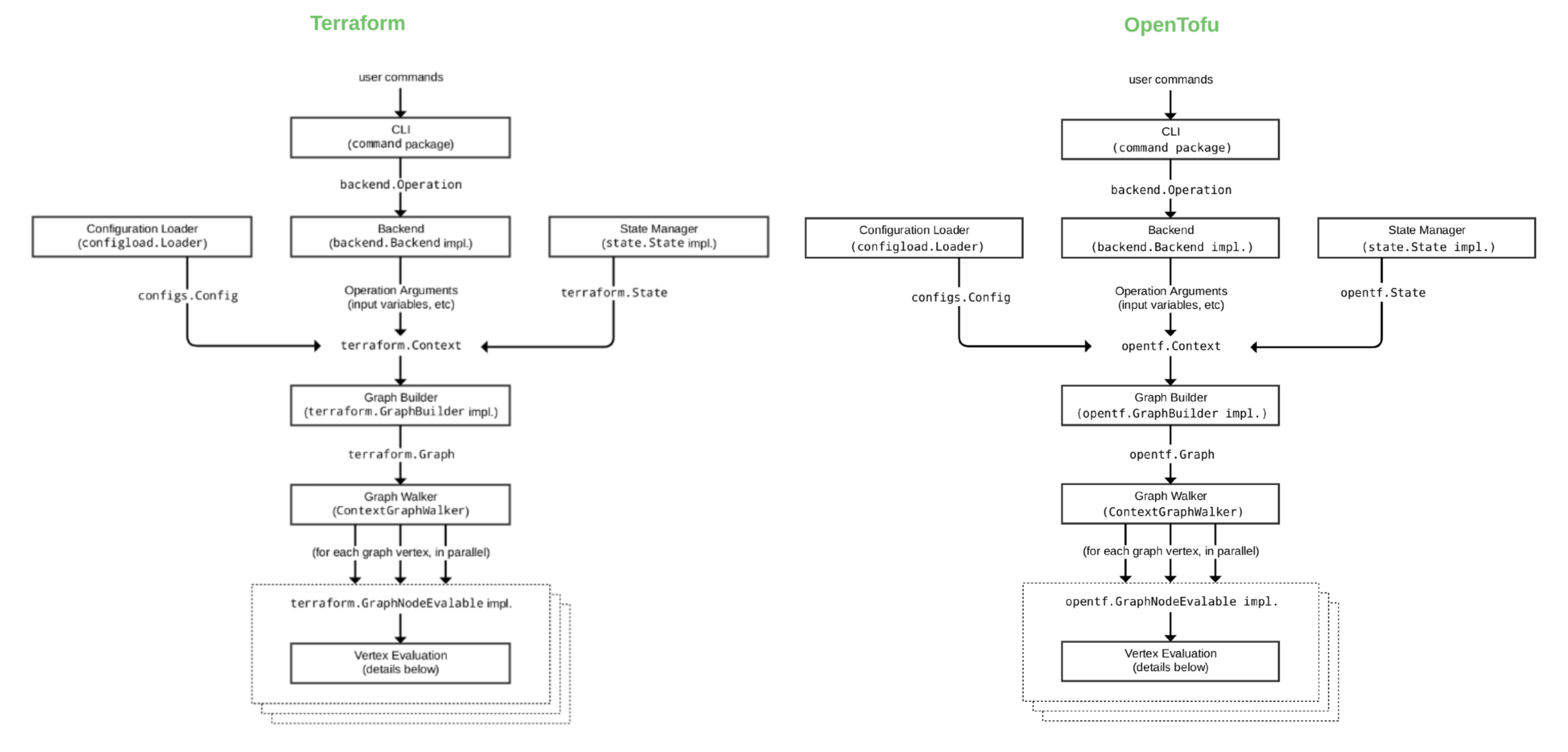 기술적인 측면에서 OpenTofu 1.6.x는 Terraform 1.6.x와 기능적으로 매우 유사하지만 앞으로는 프로젝트 기능 세트가 나눠질 것 입니다. 또 다른 주요 차이점은 OpenTofu는 오픈 소스라는 점이며, 하나의 회사가 로드맵을 지시할 수 없는 협력적인 방식으로 구성됩니다.