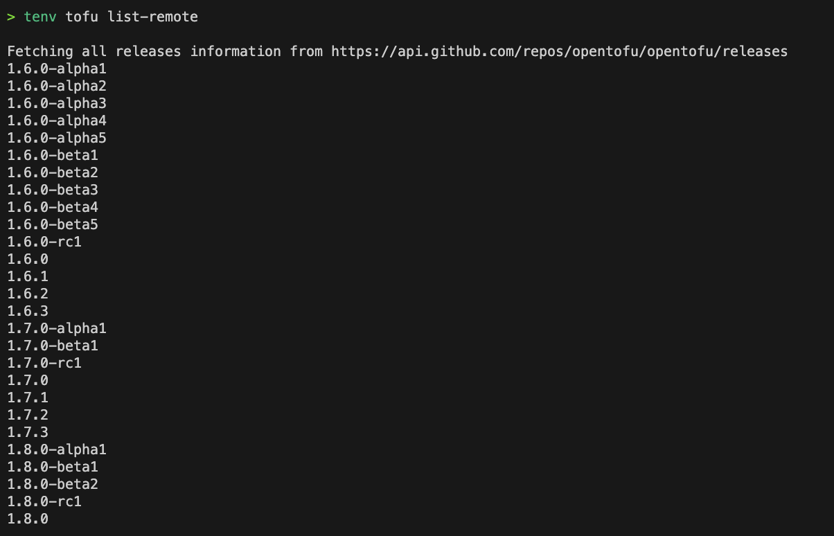 tenv로 Opentofu를 버전관리하기 때문에 먼저 OpenTofu 리스트를 확인합니다.
