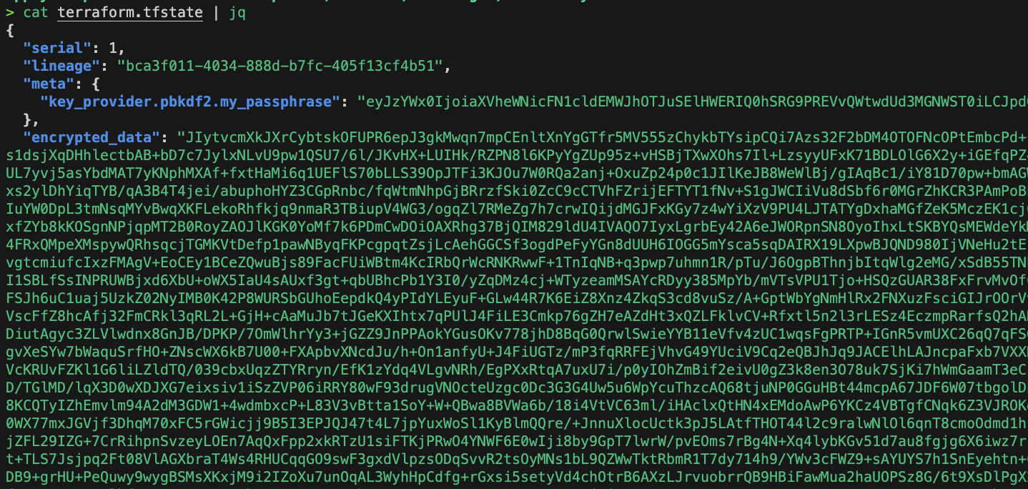 apply 실행 후 tfstate 파일을 살펴보면 아래와 같이 암호화가 진행된 것을 확인하실 수 있습니다.