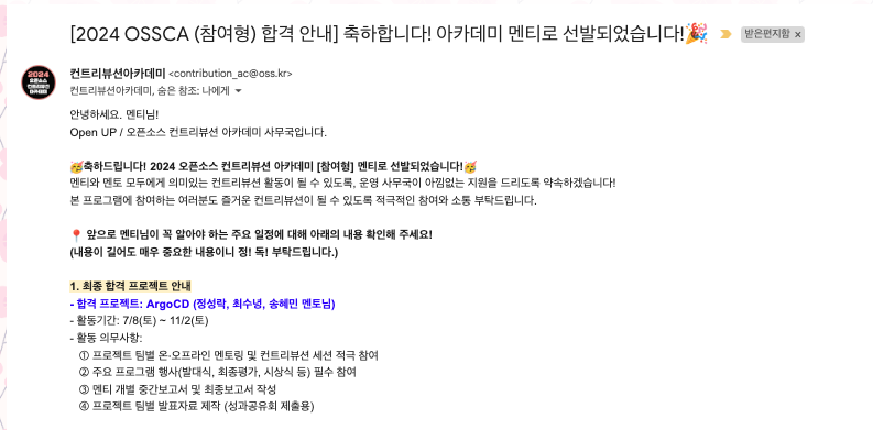 먼저, 저는 OSSCA에서 주관하는 ArgoCD 오픈소스에 기여하는 프로젝트에 합격해서 현재 참여하고 있습니다! (현재는 마스터 멘티로 선정되어서 조금 더 주도적으로 참여하고 있습니다!)