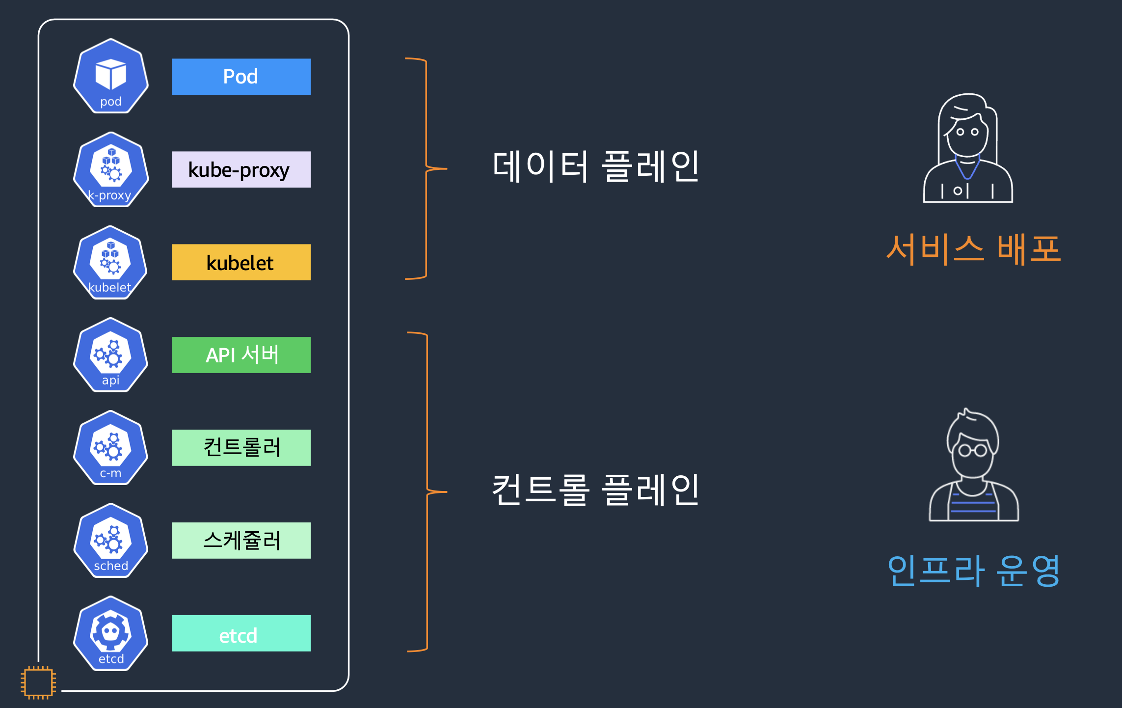 여기에는 클러스터 내에서 실행되는 애플리케이션과 서비스를 관리하고, 클러스터의 상태를 모니터링하며, 아래의 구성요소가 포함됩니다.