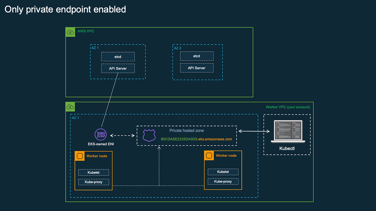 워커노드의 Kubelet → Privat Hosted Zone → EKS owned ENI → Control Plane