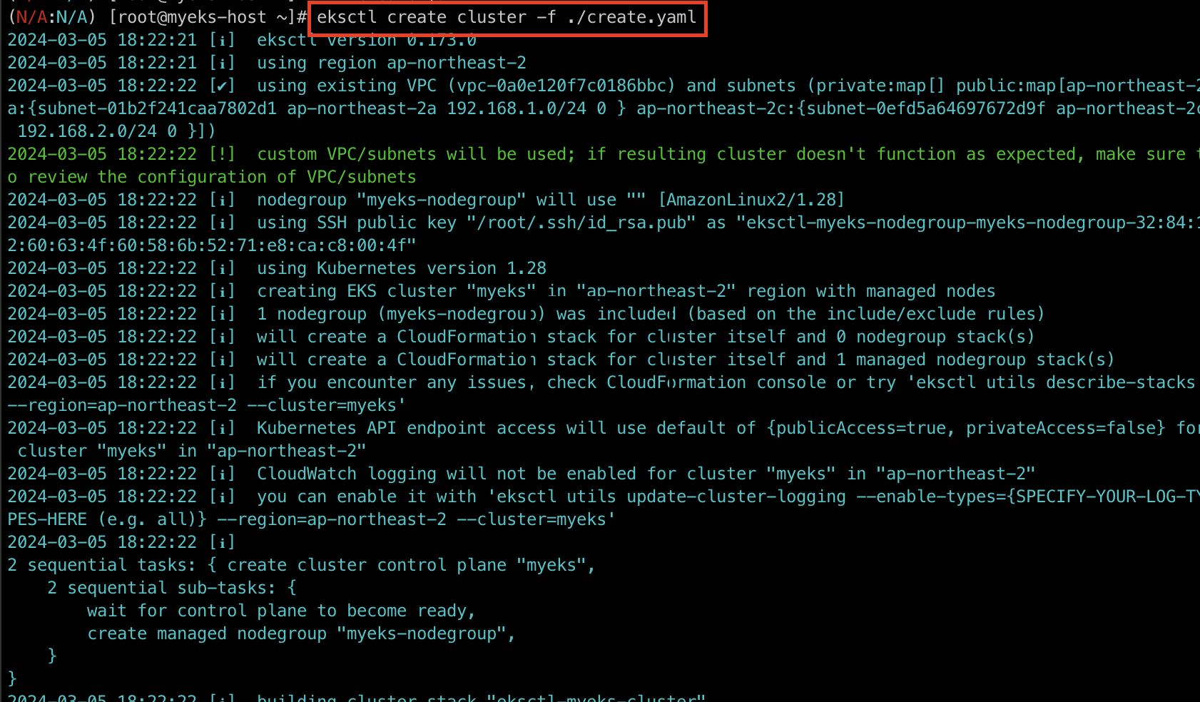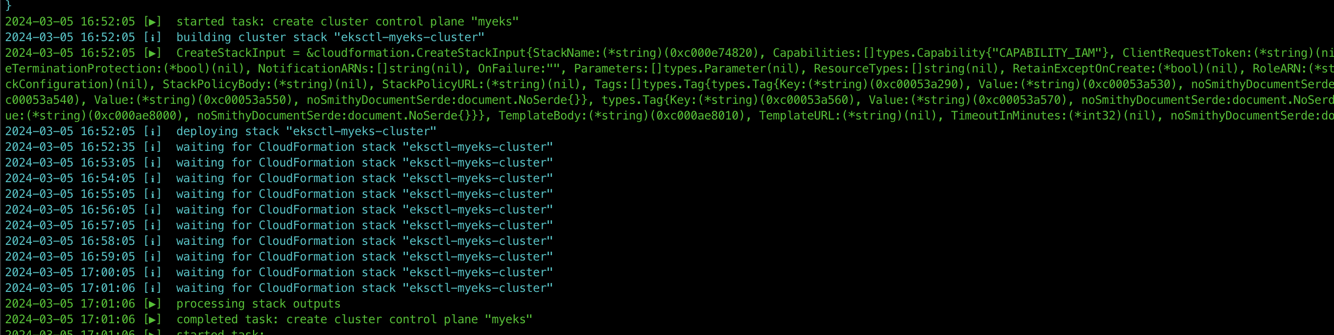 eksctl create cluster --name $CLUSTER_NAME --region=$AWS_DEFAULT_REGION --nodegroup-name=$CLUSTER_NAME-nodegroup --node-type=t3.medium \