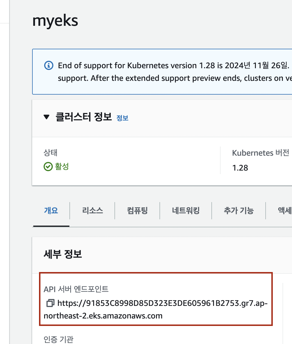 해당 명령어로 Cluster의 정보를 조회했을 때 나오는 endpoint가 곧, API server endpoint임을 확인하실 수 있습니다.