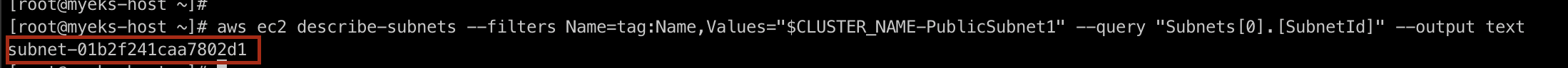 aws ec2 describe-subnets --filters Name=tag:Name,Values="$CLUSTER_NAME-PublicSubnet1" --query "Subnets[0].[SubnetId]" --output text