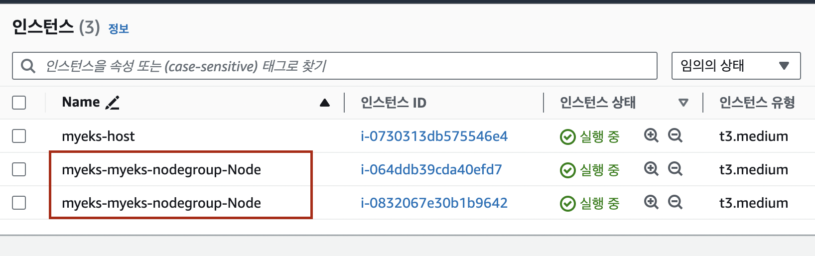 또, log에서 completed task: create managed nodegroup "myeks-nodegroup" 라는 부분이 보이게 되면 Worker Node인 nodegroup이 생성이 완료된 것입니다. 마찬가지로 AWS managed Console에서 AWS EC2 페이지에 접속하게 되면 아래와 같이 Worker Node들을 확인할 수 있습니다.