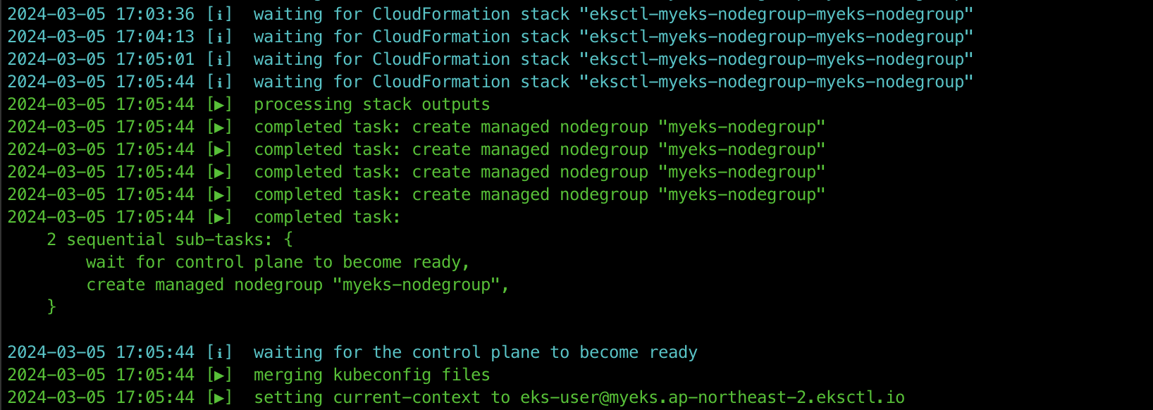eksctl create cluster --name $CLUSTER_NAME --region=$AWS_DEFAULT_REGION --nodegroup-name=$CLUSTER_NAME-nodegroup --node-type=t3.medium \