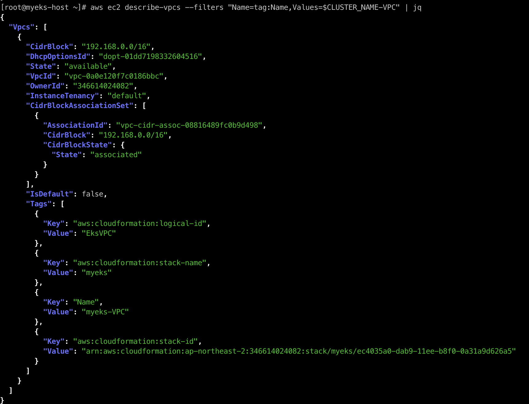 aws ec2 describe-vpcs --filters "Name=tag:Name,Values=$CLUSTER_NAME-VPC" | jq