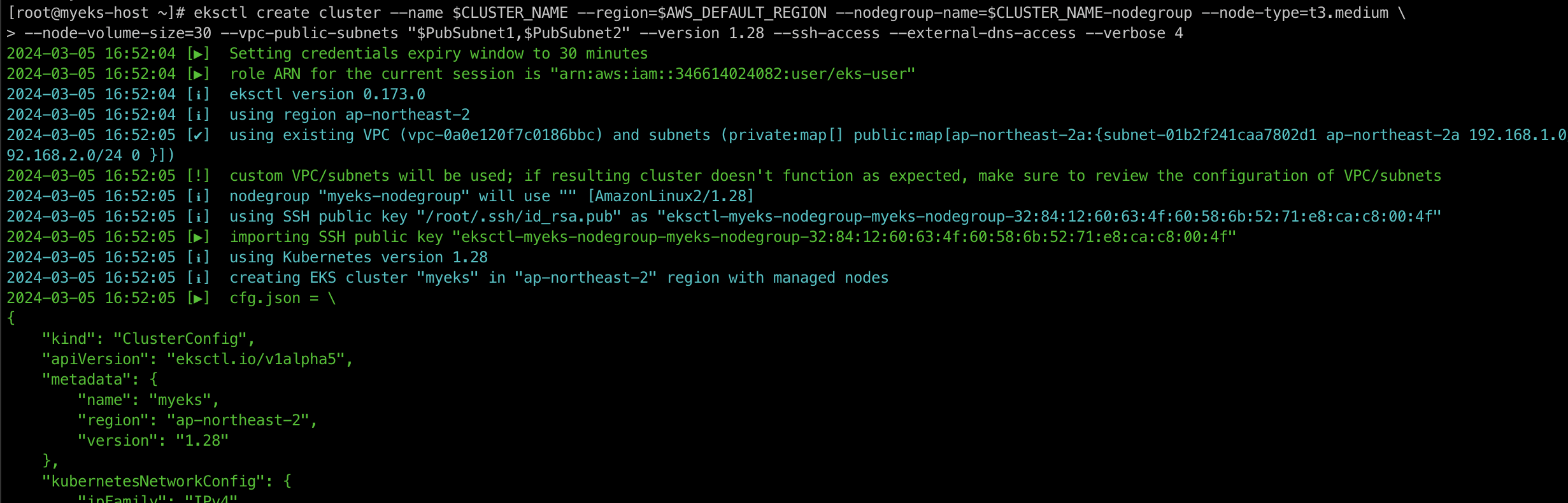 --node-volume-size=30 --vpc-public-subnets "$PubSubnet1,$PubSubnet2" --version 1.28 --ssh-access --external-dns-access --verbose 4