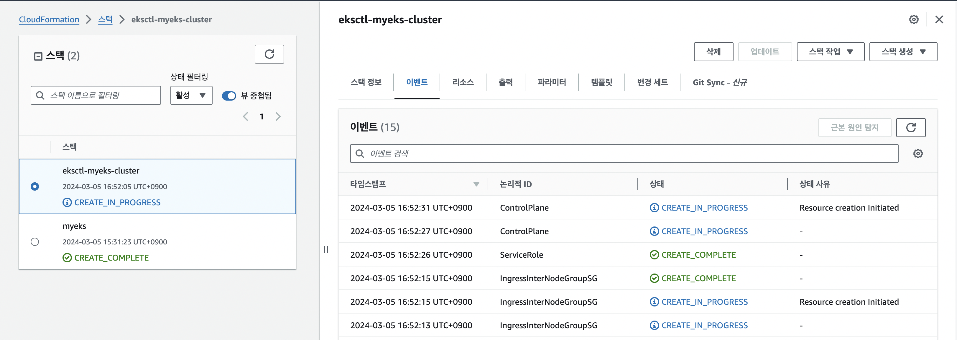 위의 명령어를 통해 EKS Cluster를 생성합니다. 이 과정에는 15분의 시간이 소요되고 AWS CloudFormation에서 어떤 stack들이 진행되는지 확인할 수 있으며 AWS EKS, EC2, SG이 차례대로 배포되는지 확인해볼 수 있습니다.