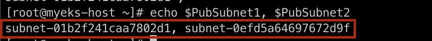 export PubSubnet2=$(aws ec2 describe-subnets --filters Name=tag:Name,Values="$CLUSTER_NAME-PublicSubnet2" --query "Subnets[0].[SubnetId]" --output text)