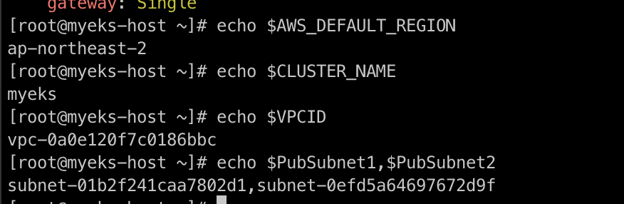 Public Subnet ID 확인 후 원활한 EKS Cluster 배포 명령어를 위해 환경 변수로 지정해줍니다.