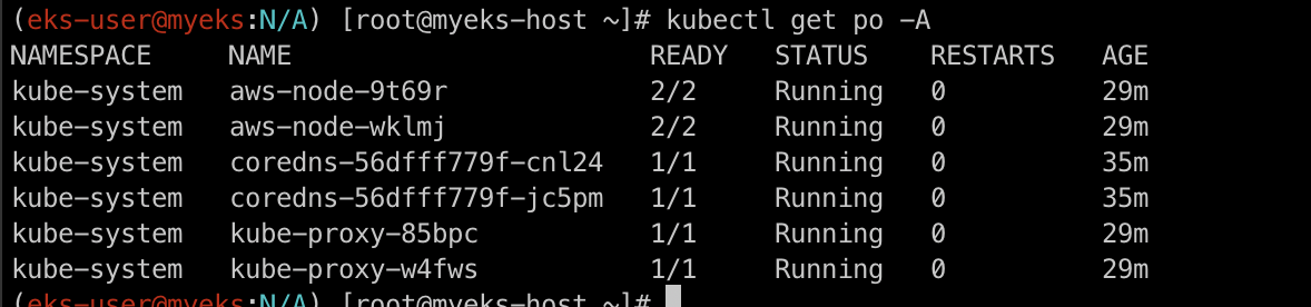 바로 Control Plane에 해당하는 pod들(kube-apiserver, kube-scheduler, kube-controller-manager, etcd등) 은 없다는 것인데요. 그것은 이전 포스트에서 말했던 AWS의 책임 및 관리 영역이기 때문입니다.