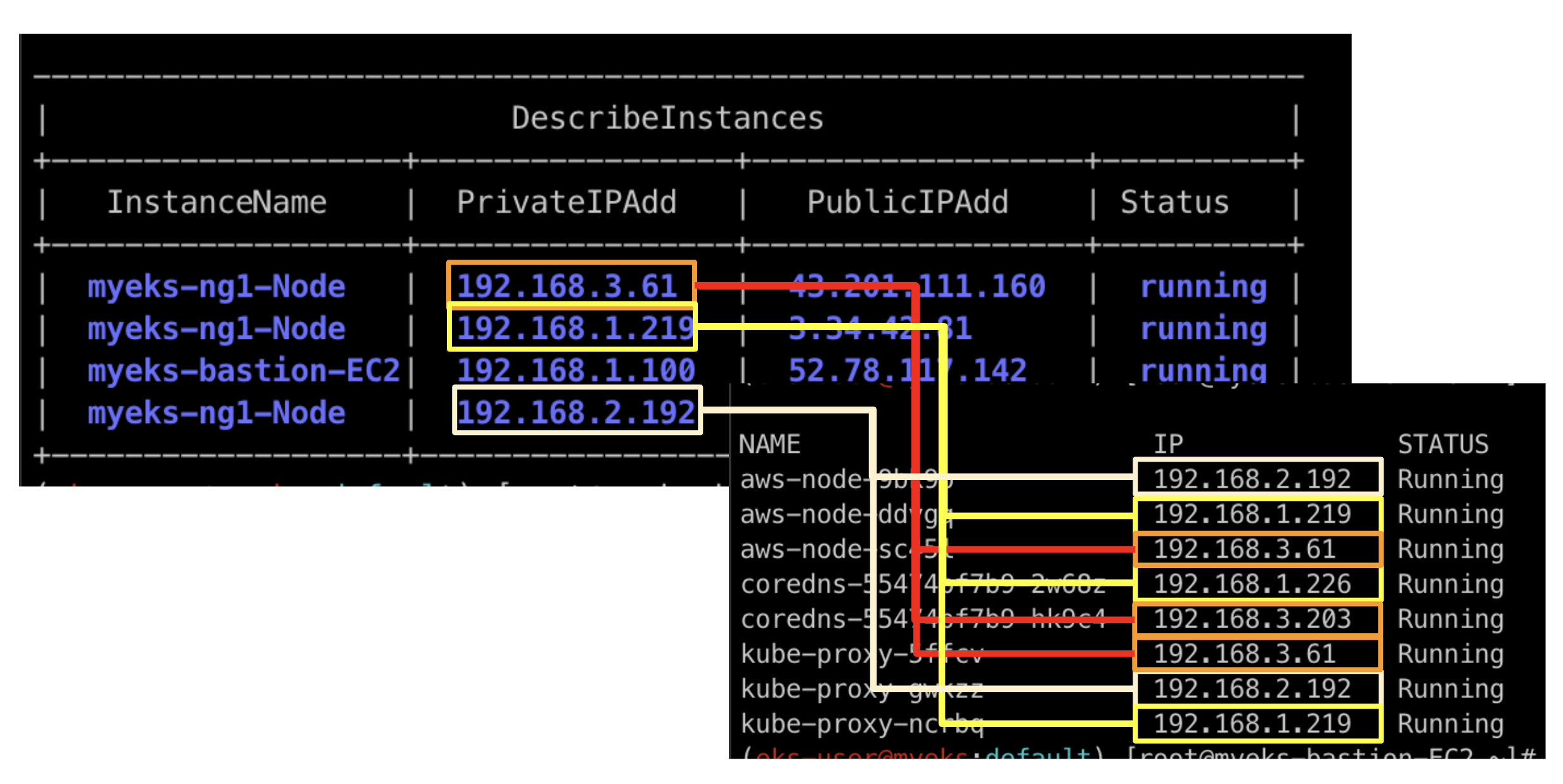 즉, EKS는 클러스터의 네트워크 대역을 VPC로 부터 할당 받기 때문에 파드는 클러스터가 위치한 VPC 내의 subnet들의 IP주소를 할당 받습니다. 그렇기에 파드의 IP 네트워크 대역과 worker node의 IP 대역이 같아서 직접 통신이 가능해집니다.