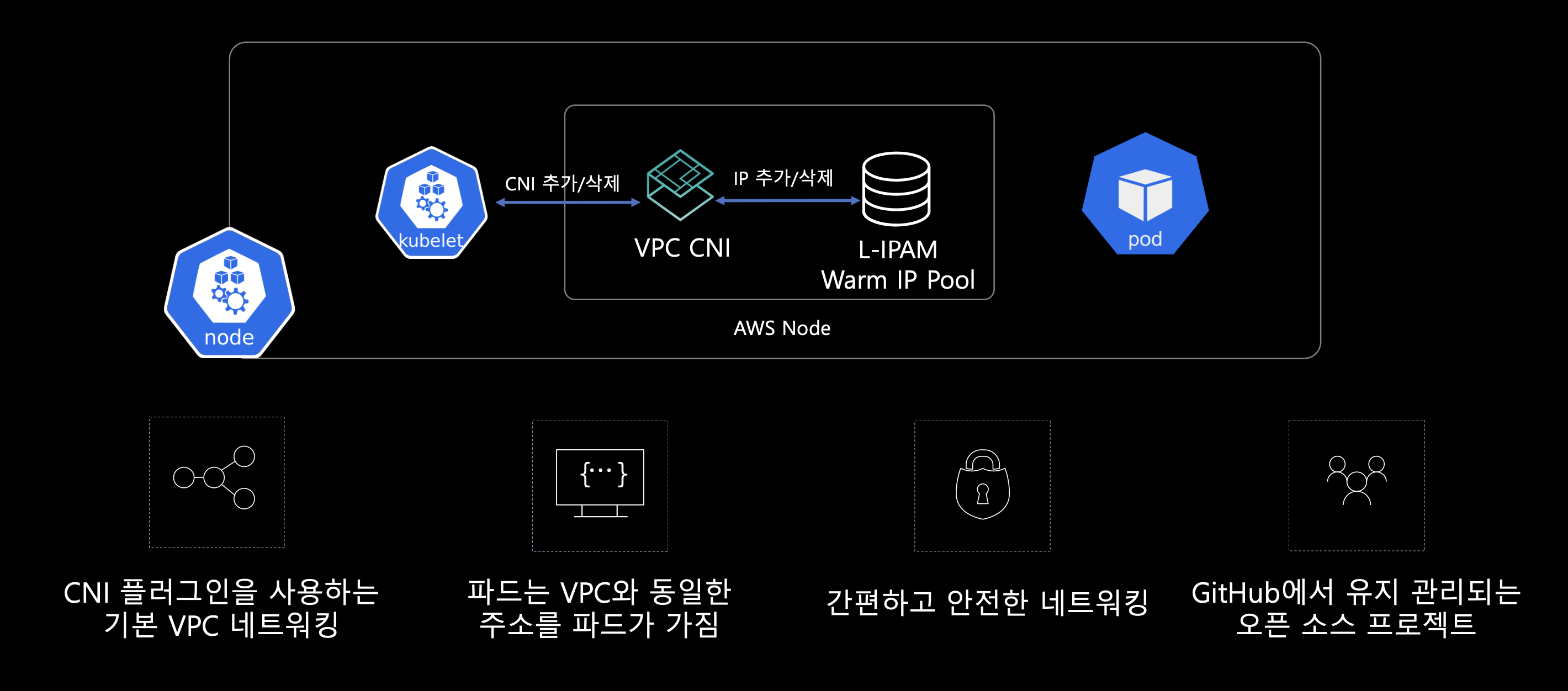 AWS VPC CNI(Amazon VPC Container Network Interface)는 AWS에서 제공하는 쿠버네티스 네트워크 플러그인입니다. 이 플러그인은 쿠버네티스 클러스터를 AWS의 Virtual Private Cloud(VPC) 내에서 직접 실행할 수 있게 해주며, 컨테이너에 AWS VPC의 네이티브 IP 주소를 할당합니다. 이를 통해 컨테이너가 VPC 내의 리소스와 직접 통신할 수 있게 되어, 네트워크 성능이 향상되고 관리가 용이해집니다.