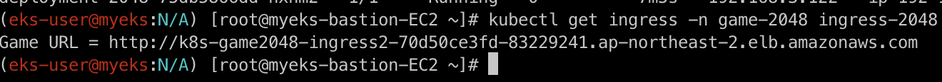 kubectl get ingress -n game-2048 ingress-2048 -o jsonpath={.status.loadBalancer.ingress[0].hostname} | awk '{ print "Game URL = http://"$1 }'