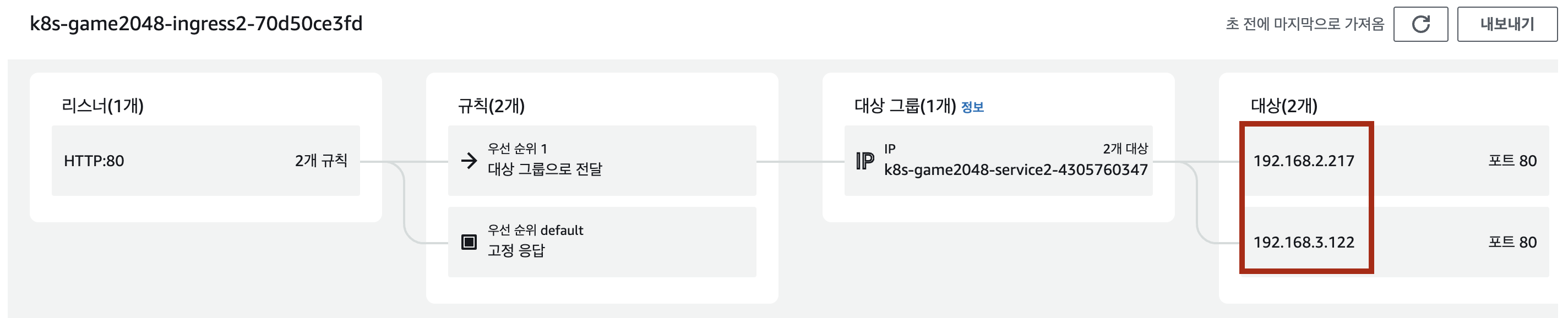 먼저, AWS Manage Console - EC2 - 로그밸런서에서 해당 Ingress ALB의 리소스맵을 확인해보시면 리스너 - 규칙 - 대상그룹 - 대상에 2개의 Pod IP가 연결된 것을 확인하실 수 있습니다.