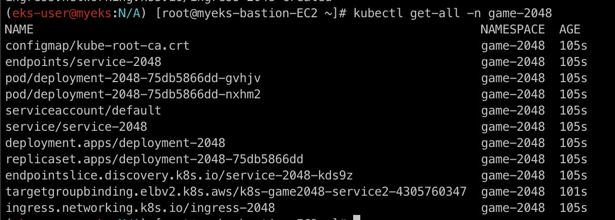 위의 명령어를 통해 game-2048 네임스페이스에 있는 모든 kubernetes 리소스들을 확인해보겠습니다.