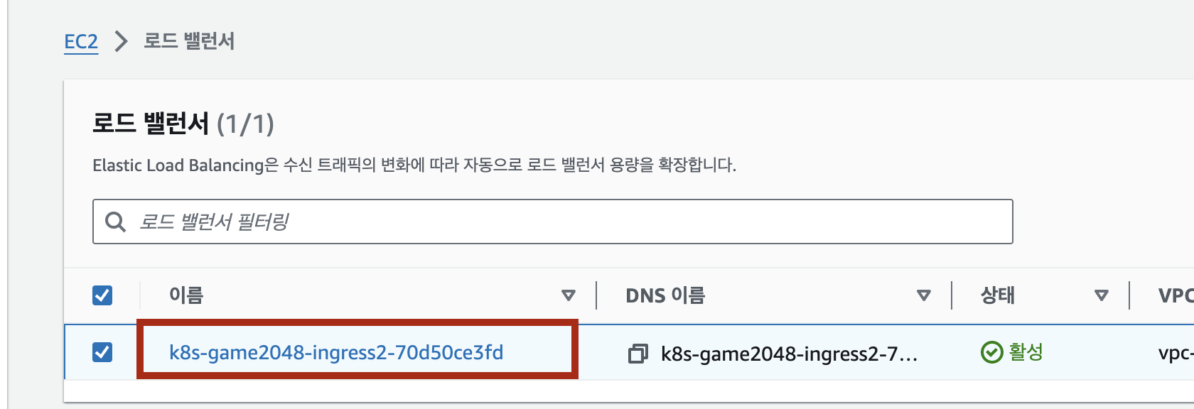 일정 시간(대략 1분~5분)정도 후 다시 확인해보면 active로 바뀐 값을 확인할 수 있고 AWS Manage Console - EC2 - 로그밸런서 메뉴에서 확인해보시면 정상적으로 활성화된 ingress ALB를 확인하실 수 있습니다.