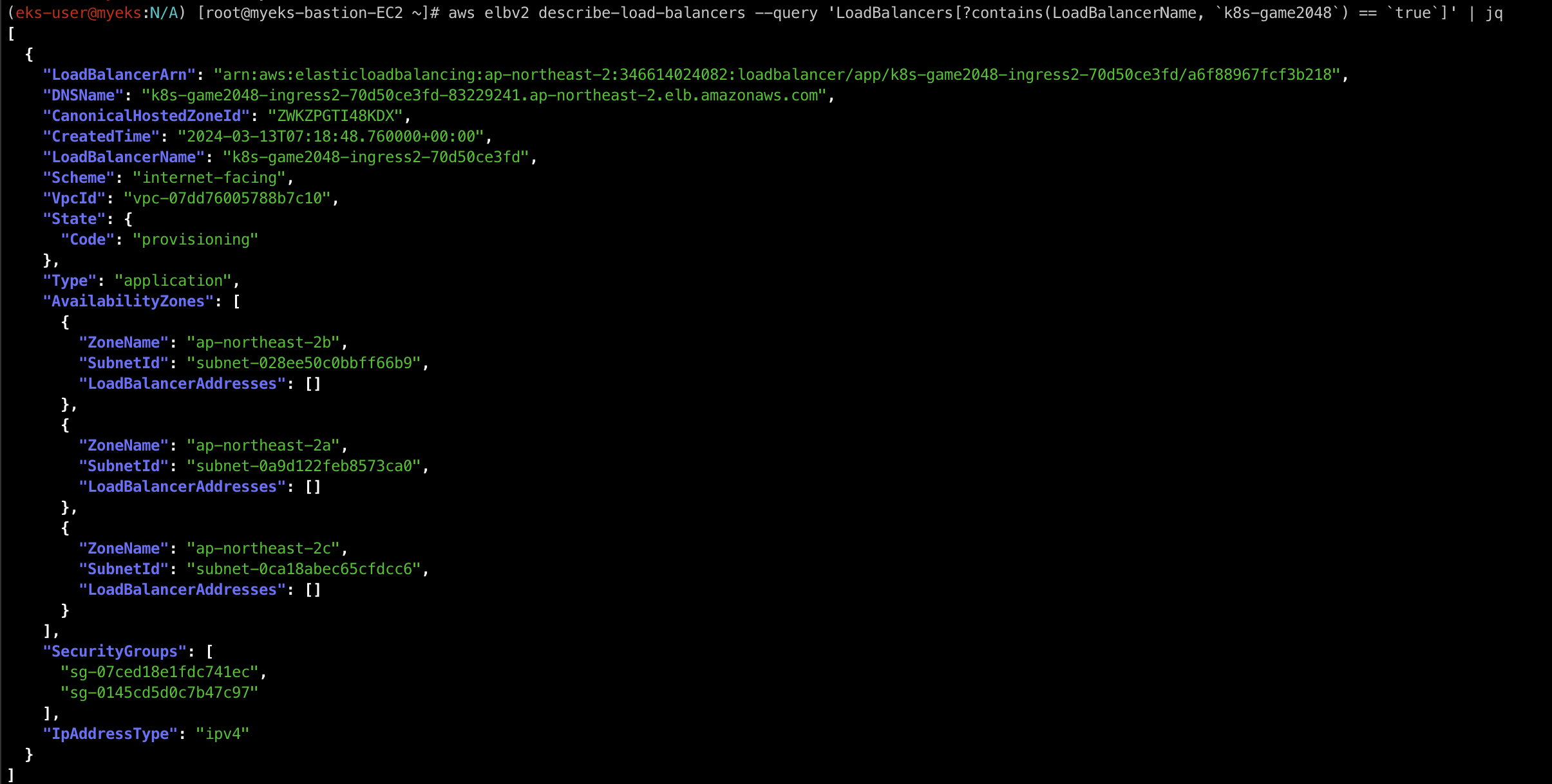 aws elbv2 describe-load-balancers --query 'LoadBalancers[?contains(LoadBalancerName, `k8s-game2048`) == `true`]' | jq