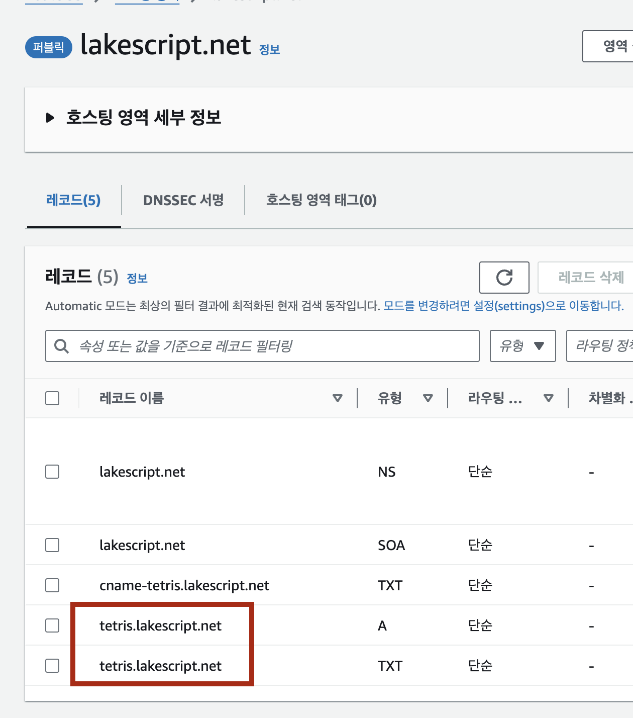이제 AWS Route53에서 직접 호스팅 영역을 확인해보겠습니다.