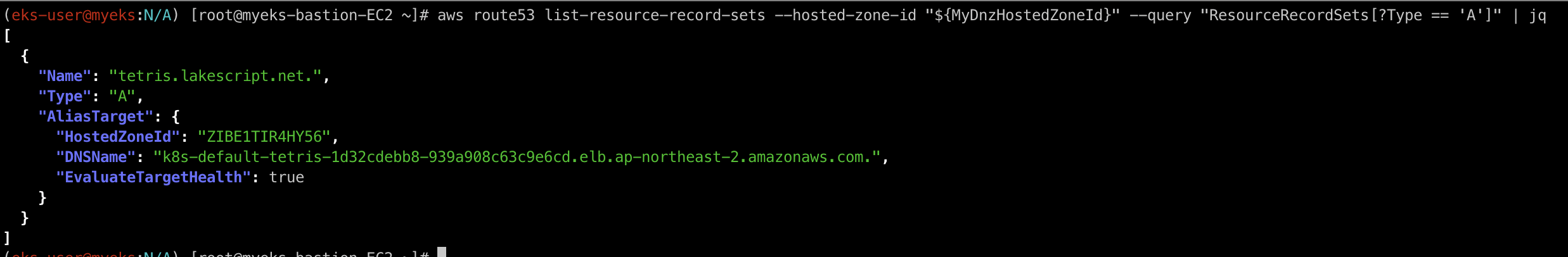 위의 명령어를 통해 현재 AWS Route53 호스팅 영역에 A Type의 레코드들을 확인해보겠습니다.