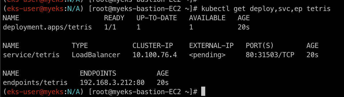 위의 명령어를 통해 tetris service인 LB가 설정되었는지 확인합니다.