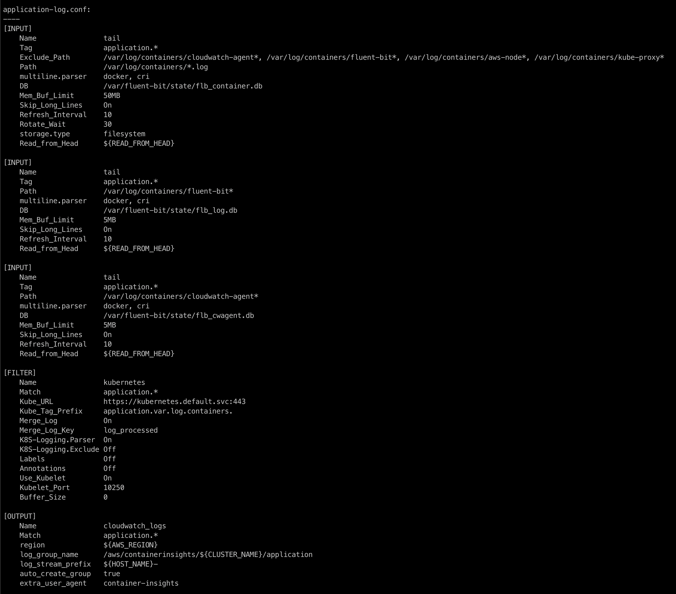 설정에는 application-log.conf , dataplane-log.conf , fluent-bit.conf , host-log.conf , parsers.conf로 구성되어 있으며 각각 INPUT/FILTER/OUTPUT 필터가 적용되어 있습니다.