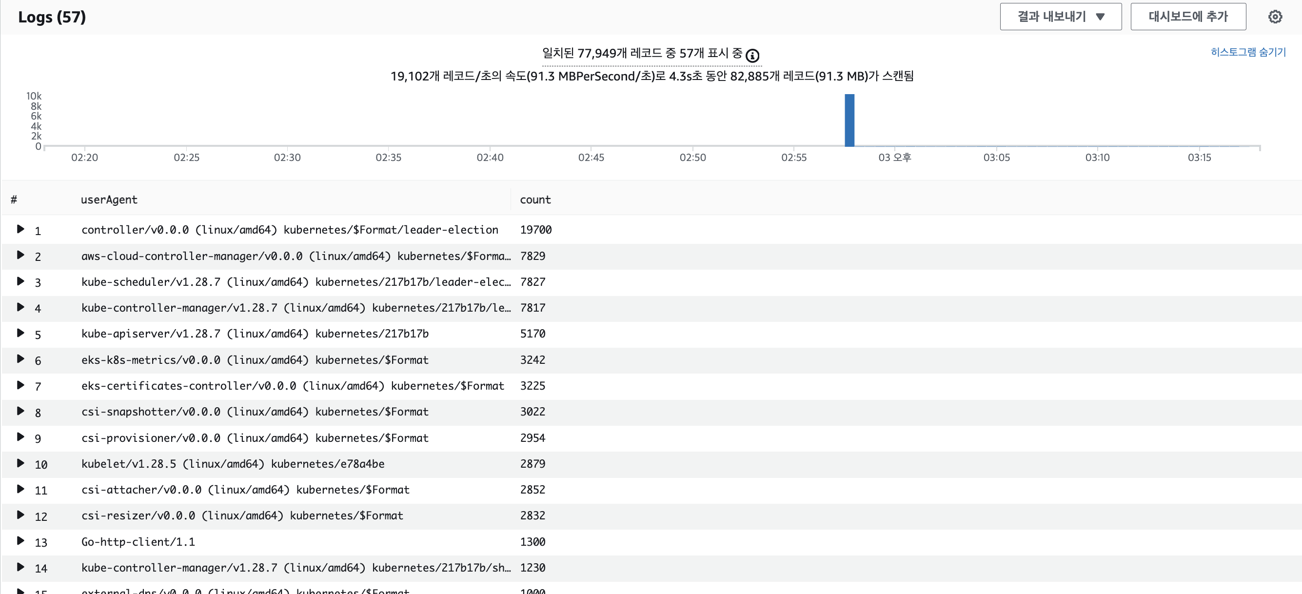 kube-apiserver-audit 로그에서 userAgent 정렬해서 아래 4개 필드 정보 검색