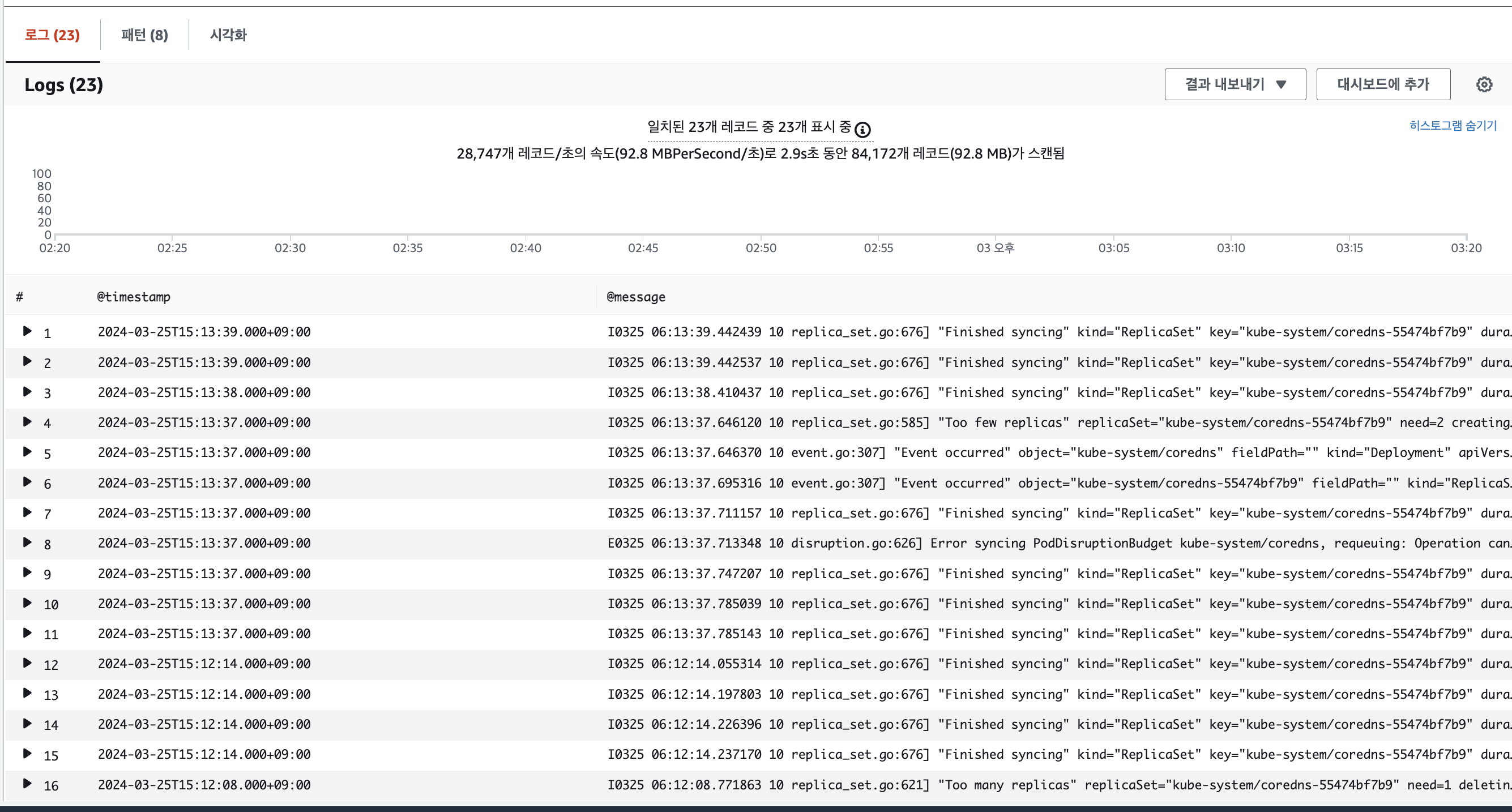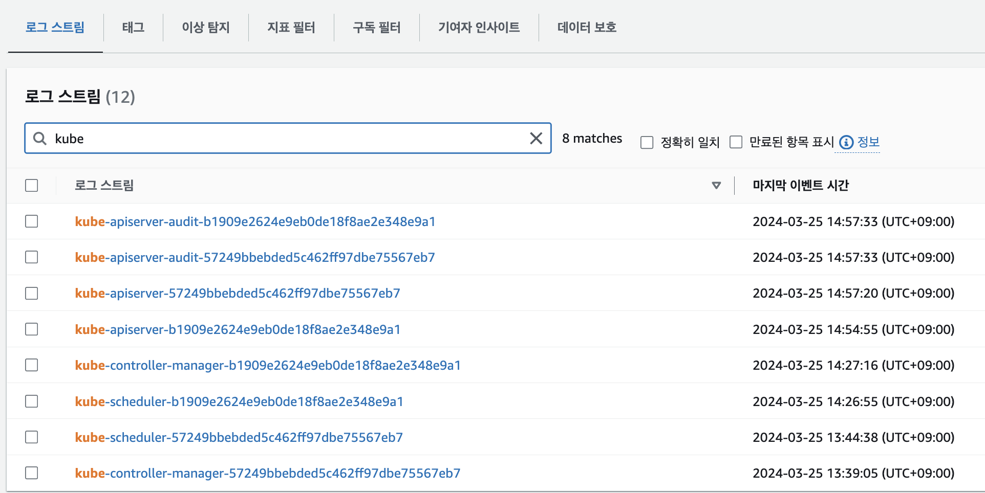 그 후 CloudWatch에 접근해서 kube 필터로 로그 스트림을 살펴보면 정상적으로 로그를 수집중임을 확인하실 수 있습니다.