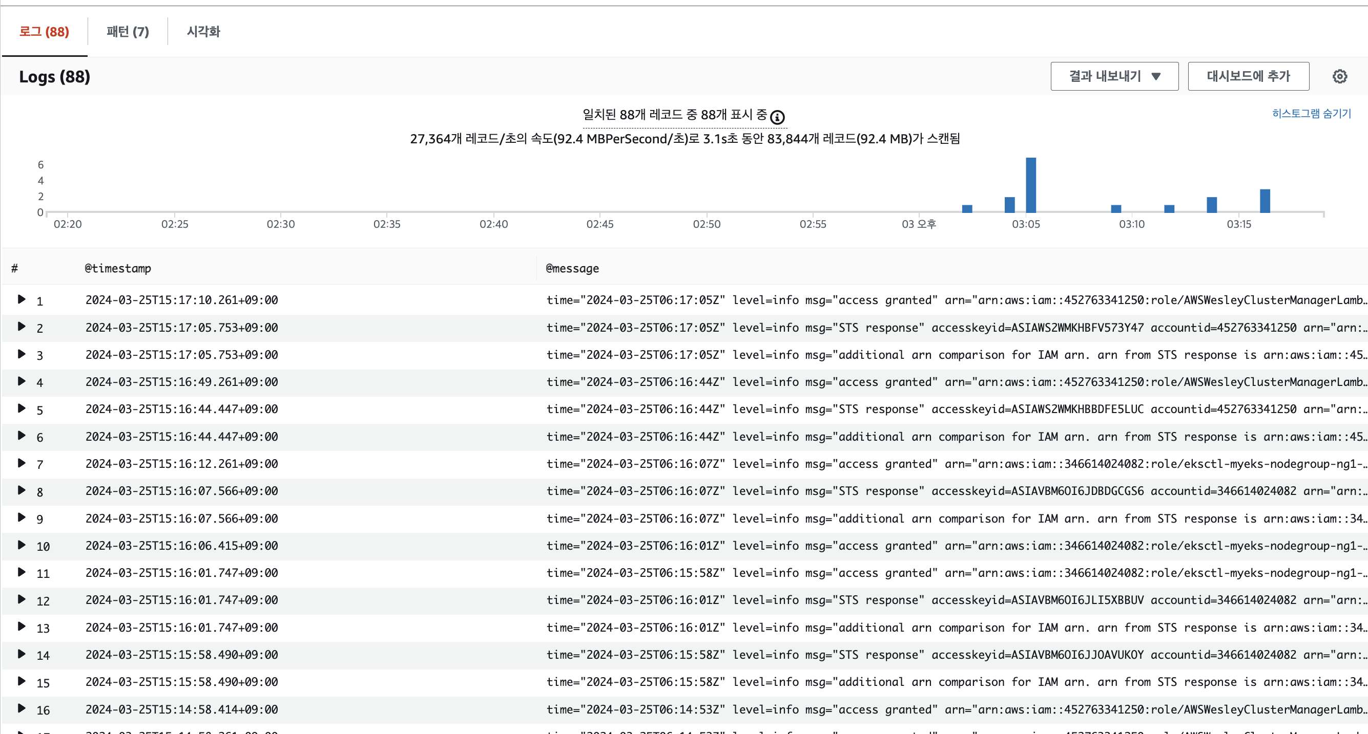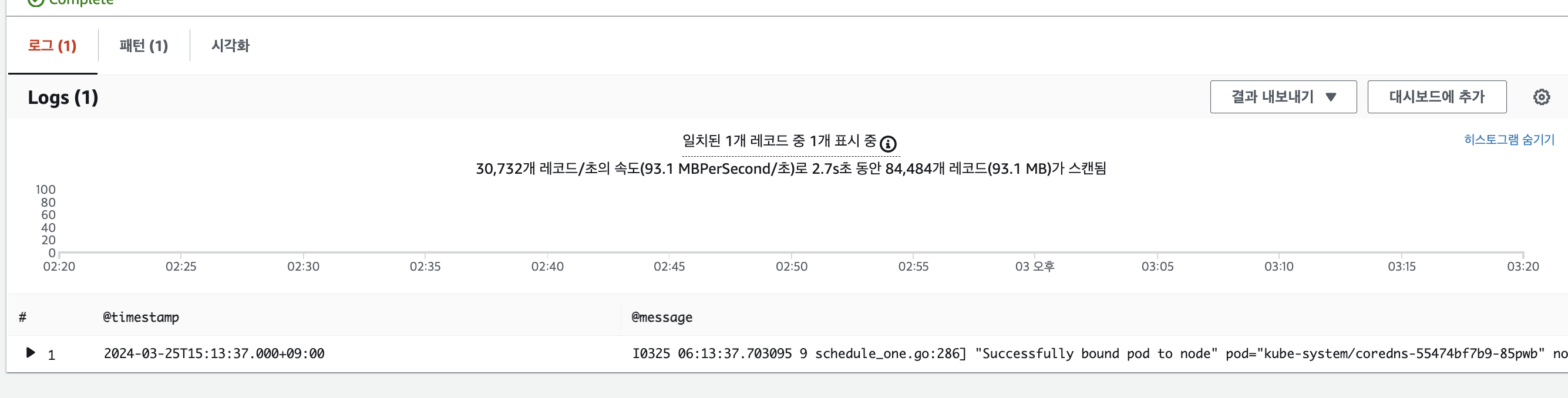 kubectl -n amazon-cloudwatch logs -l k8s-app=fluent-bit -f # 파드 로그 확인