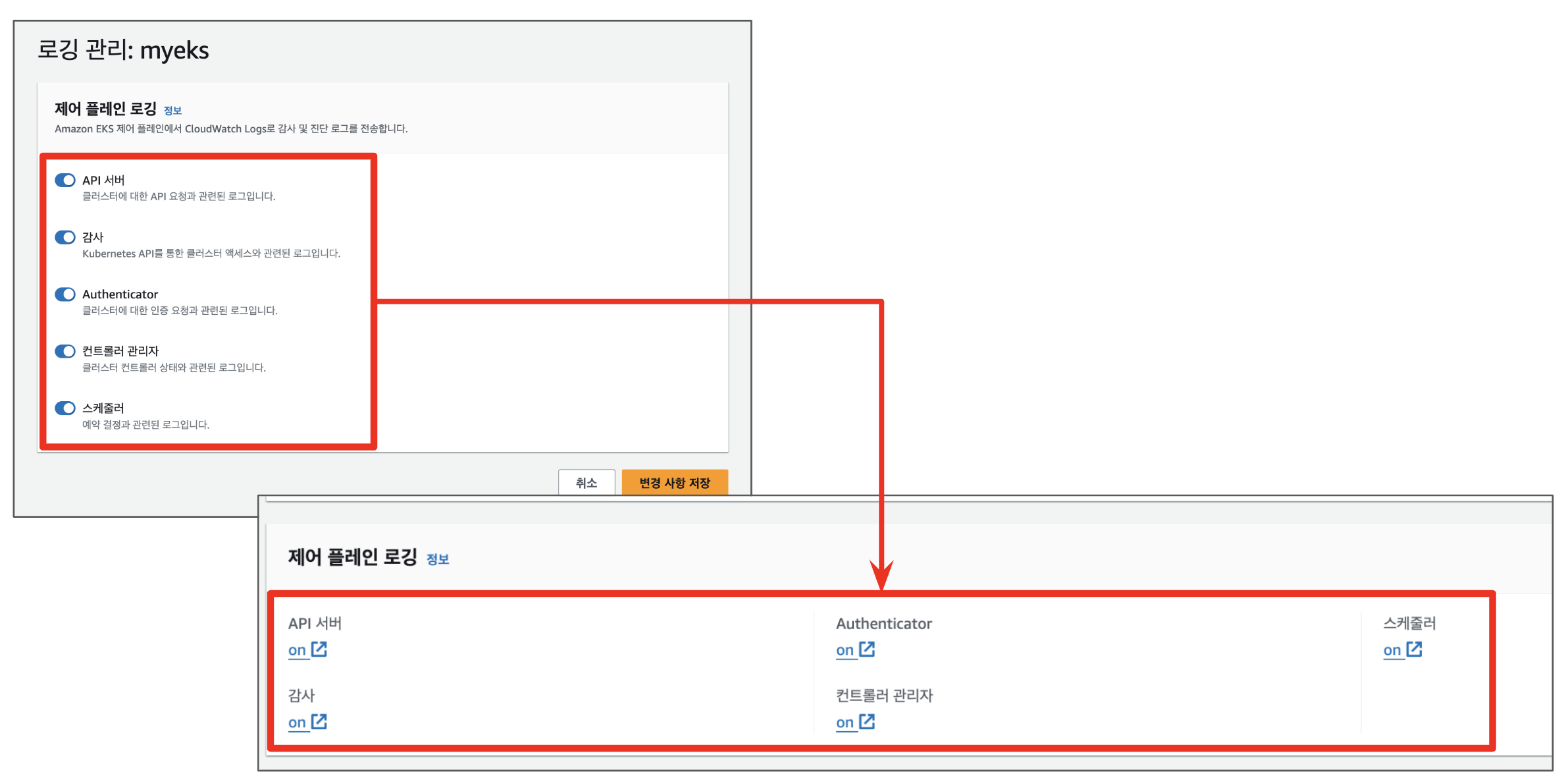 모두 Logging을 하기 위해 오른쪽 상단에 있는 로깅 관리 버튼을 클릭하고 각각 On으로 설정하고 저장합니다. 설정되기 까지 짧은 시간이 소요되는데, 새로고침 하게 되면 제어플레인 로깅 부분에서 모든 리소스의 Logging이 On으로 설정된 것을 확인하실 수 있습니다.