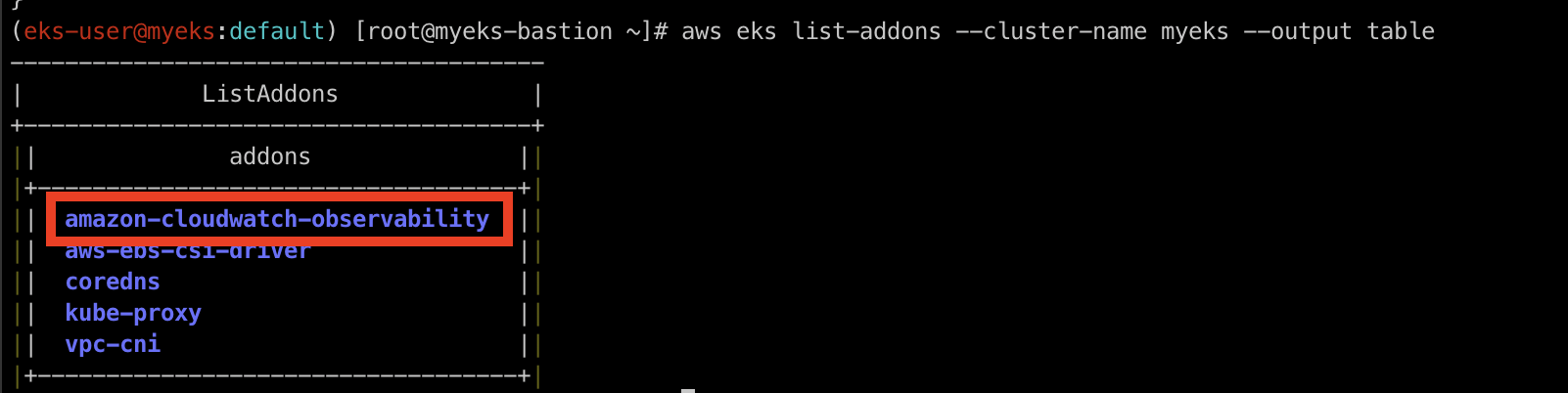 위의 명령어를 통해 addon으로 amazon-cloudwatch-observability를 설치합니다.
