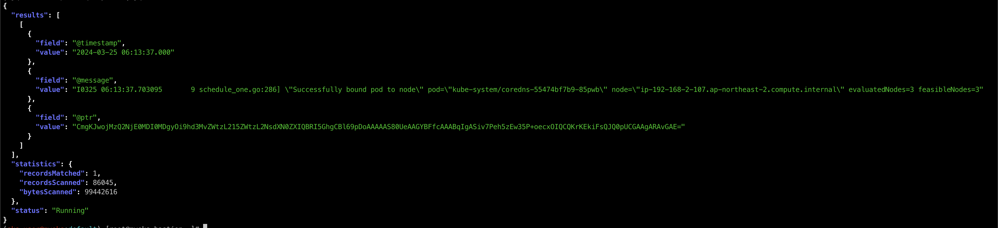 --query-string 'fields @timestamp, @message | filter @logStream ~= "kube-scheduler" | sort @timestamp desc' \