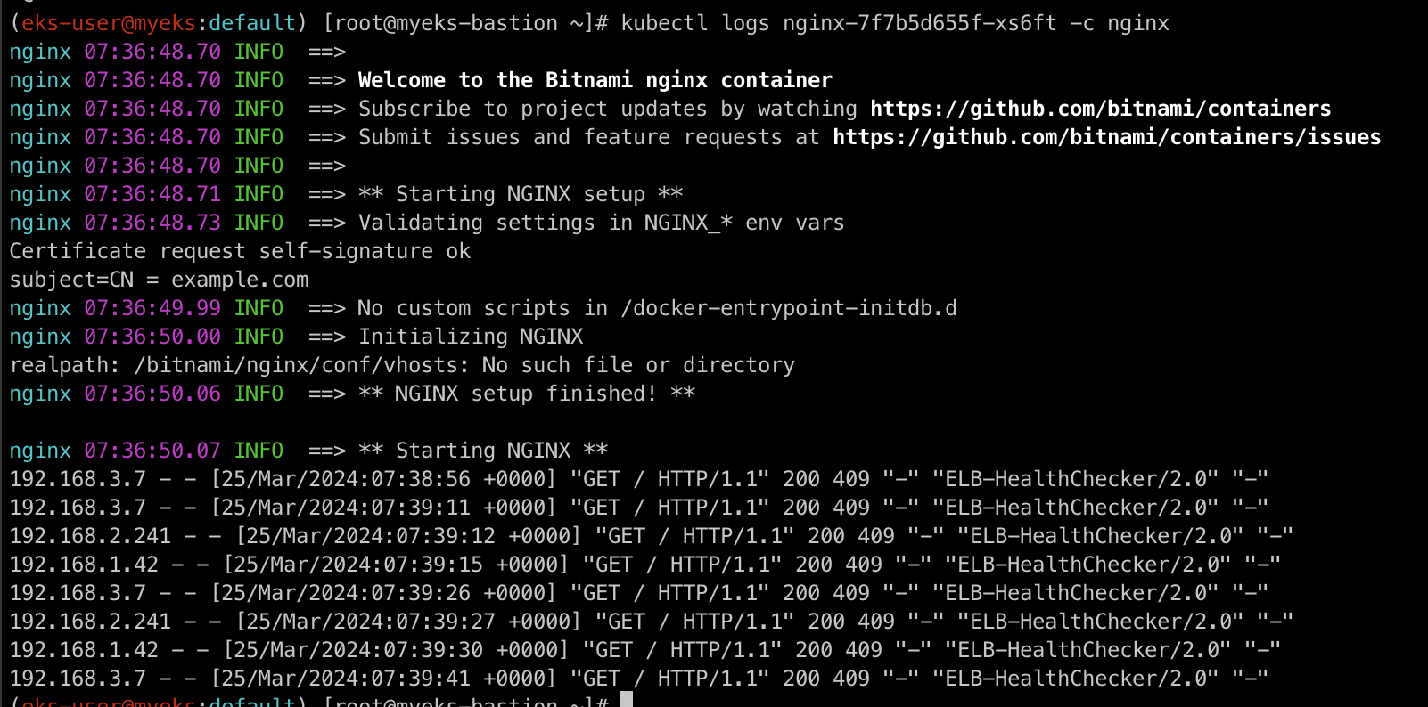 kubectl logs 명령어를 통해 위에서 배포한 nginx pod의 로그를 확인해보겠습니다.