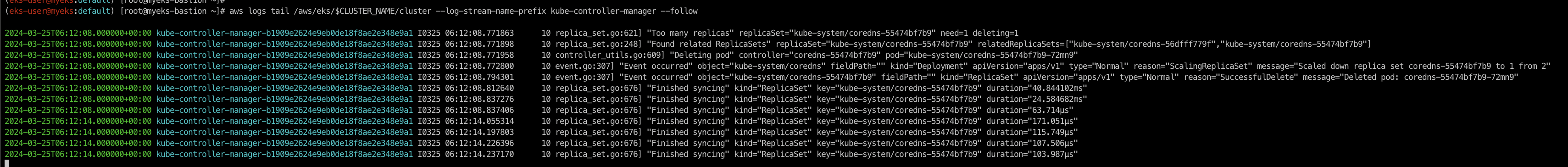 aws logs tail /aws/eks/$CLUSTER_NAME/cluster --log-stream-name-prefix kube-controller-manager --follow
