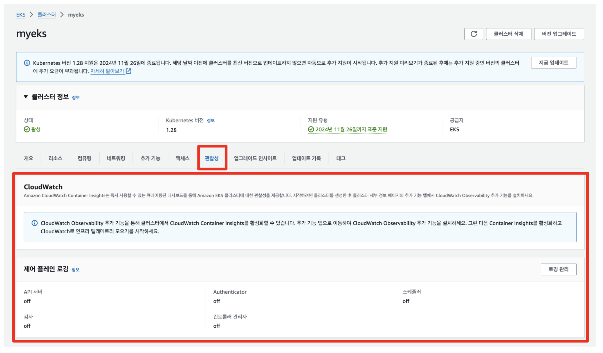 AWS Managed Console에 접근하여 EKS메뉴 > 관찰성 탭으로 이동합니다. 그러면 위의 사진과 같이 API 서버, Authenticator, 스케줄러, 감시, 컨트롤러 관리자가 모두 off로 설정되어 있는 것을 확인하실 수 있습니다.