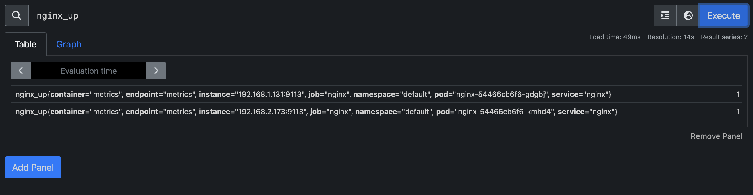 현재 nginx deployments의 갯수는 1개입니다. 해당 데이터는 nginx_up을 통해 확인하실 수 있습니다.