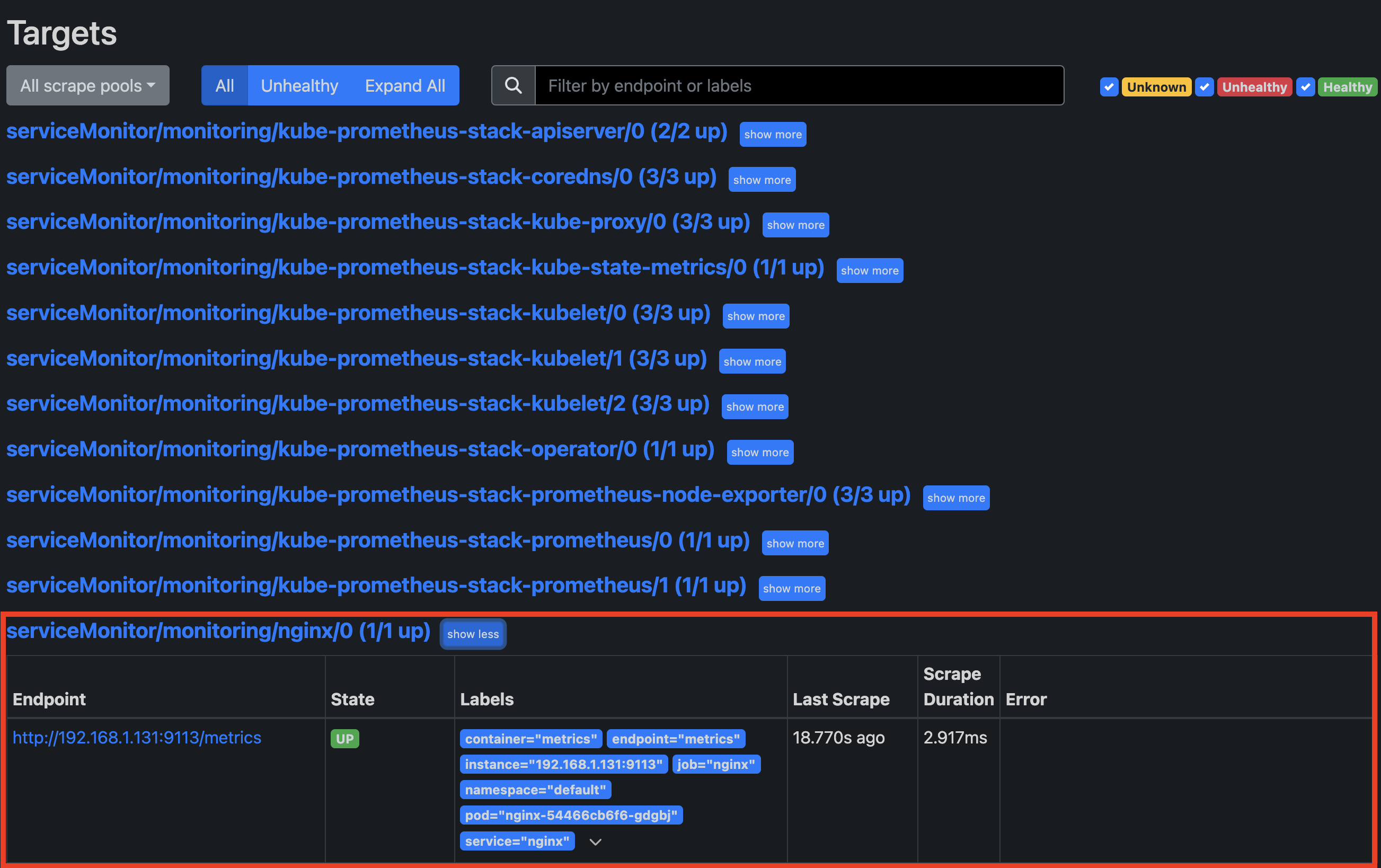 서비스 모니터 방식으로 nginx 모니터링 대상을 등록하고, export 는 9113 포트 사용합니다.