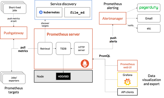 즉, 클라이언트에서 서버로 데이터를 보내는 것(PUSH)가 아닌 서버가 클라이언트의 데이터를 수집(Pull) 방식입니다. 이러한 방식은 기존의 에이전트(agent) 방식보다 더 유연하고 관리하기 쉽습니다.