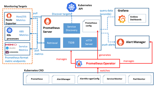 - Prometheus와 관련된 설정, 서비스 디스커버리, 룰 및 대시보드를 관리할 수 있습니다.