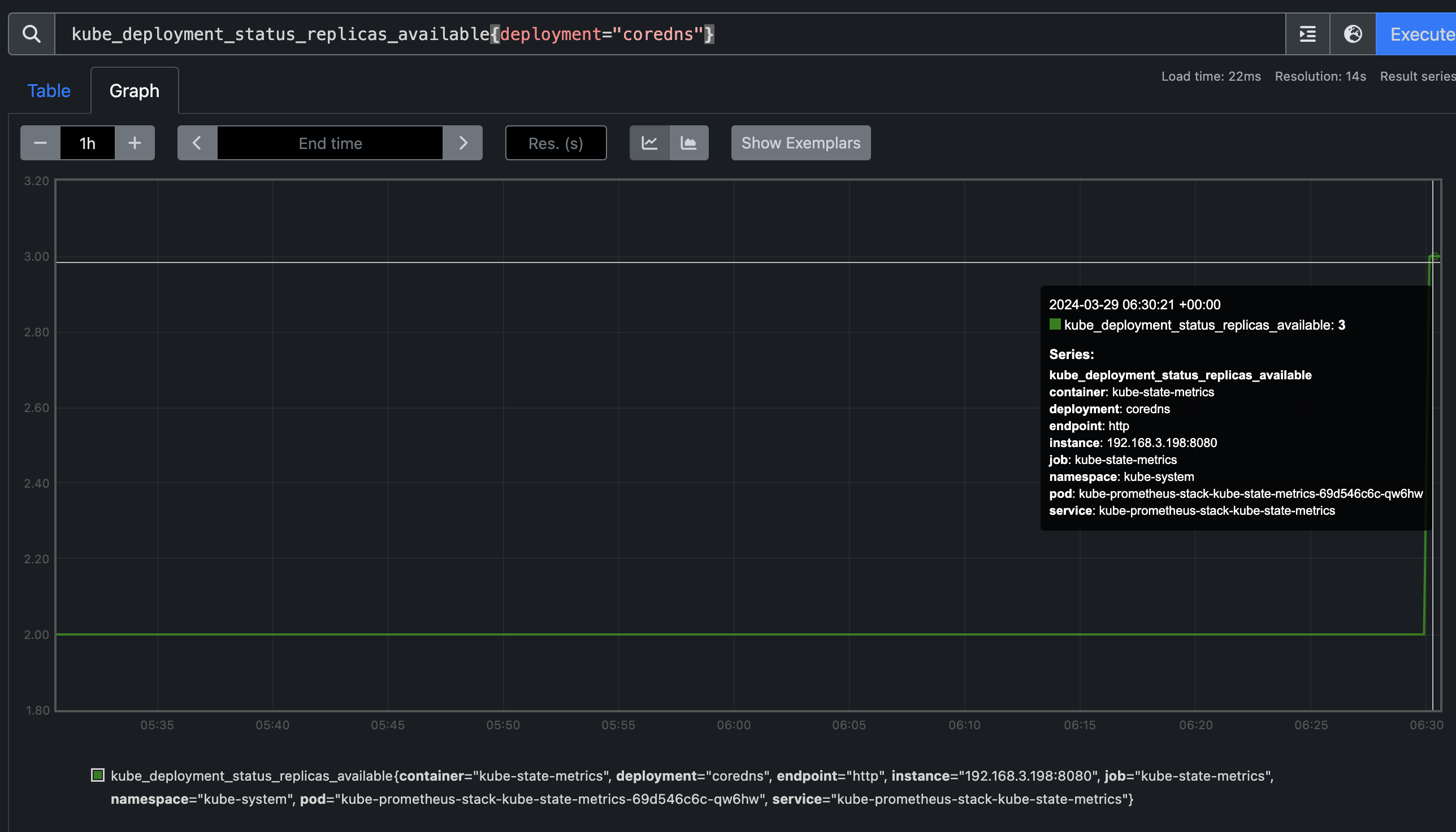 그러고 다시 kube_deployment_status_replicas_available{deployment="coredns"} 쿼리를 입력하니 3개로 보여지는 것을 확인하실 수 있습니다!