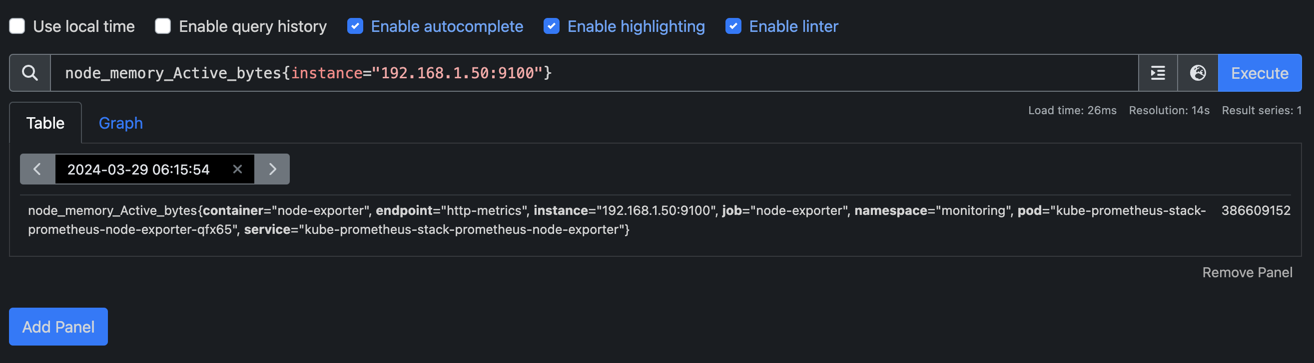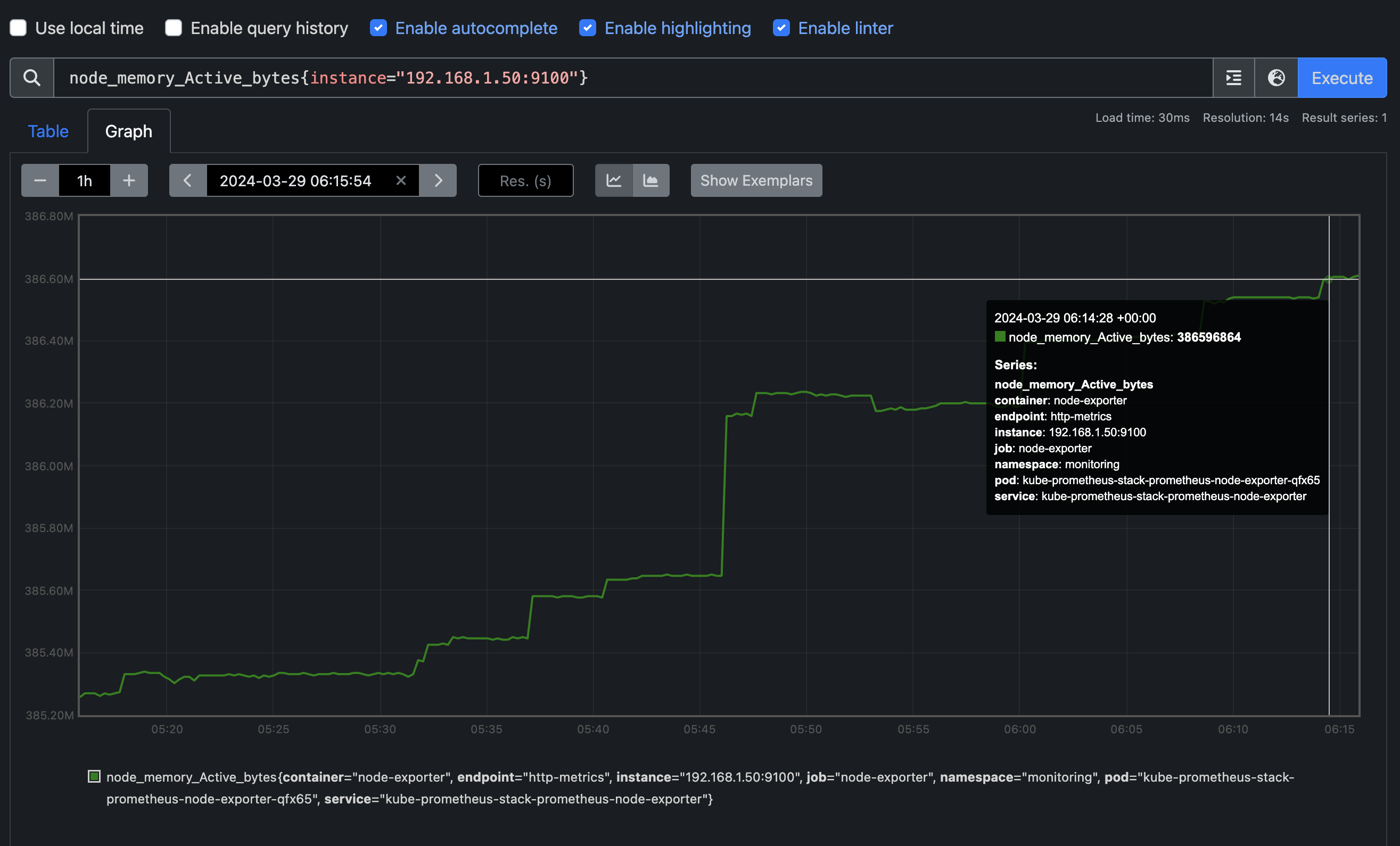 이렇듯 {instance=} 구문을 통해 특정 instance의 node_memory_Active_bytes 값을 확인하실 수 있습니다.