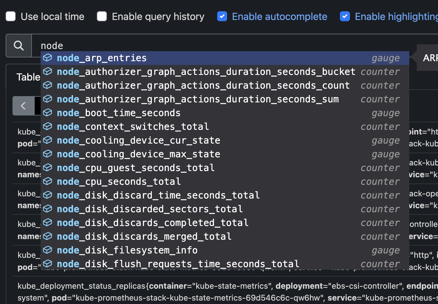 node_exporter로 수집된 값들을 보실려면 node만 입력후 자동완성으로 검색되는 값들을 확인하실 수 있습니다.