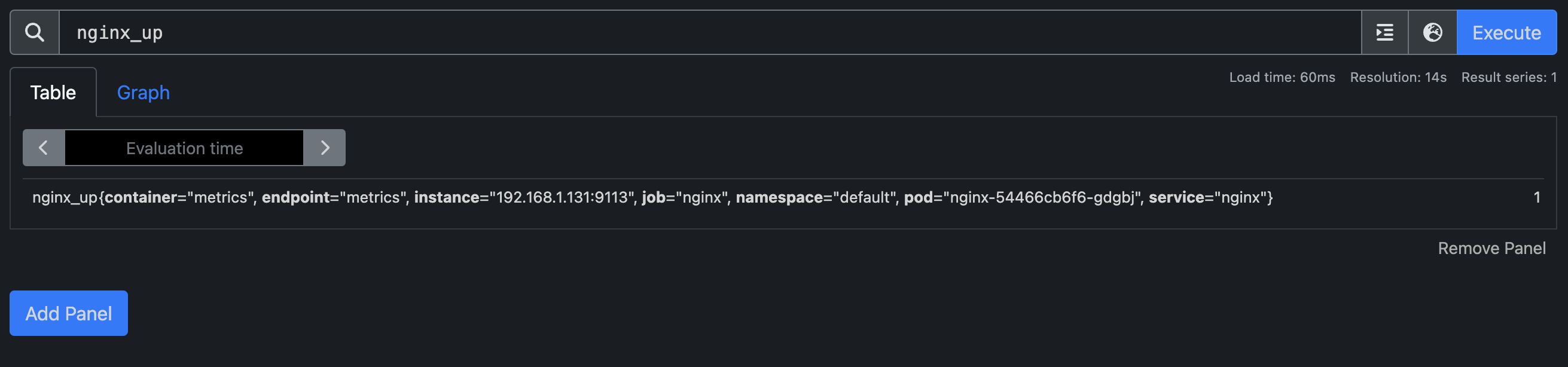 현재 nginx deployments의 갯수는 1개입니다. 해당 데이터는 nginx_up을 통해 확인하실 수 있습니다.