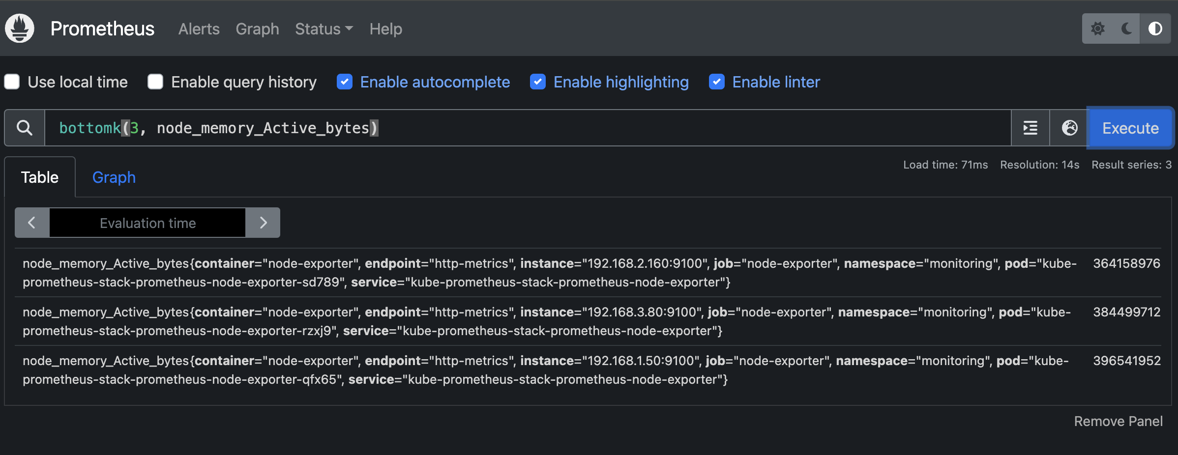 bottomk(3, node_memory_Active_bytes)