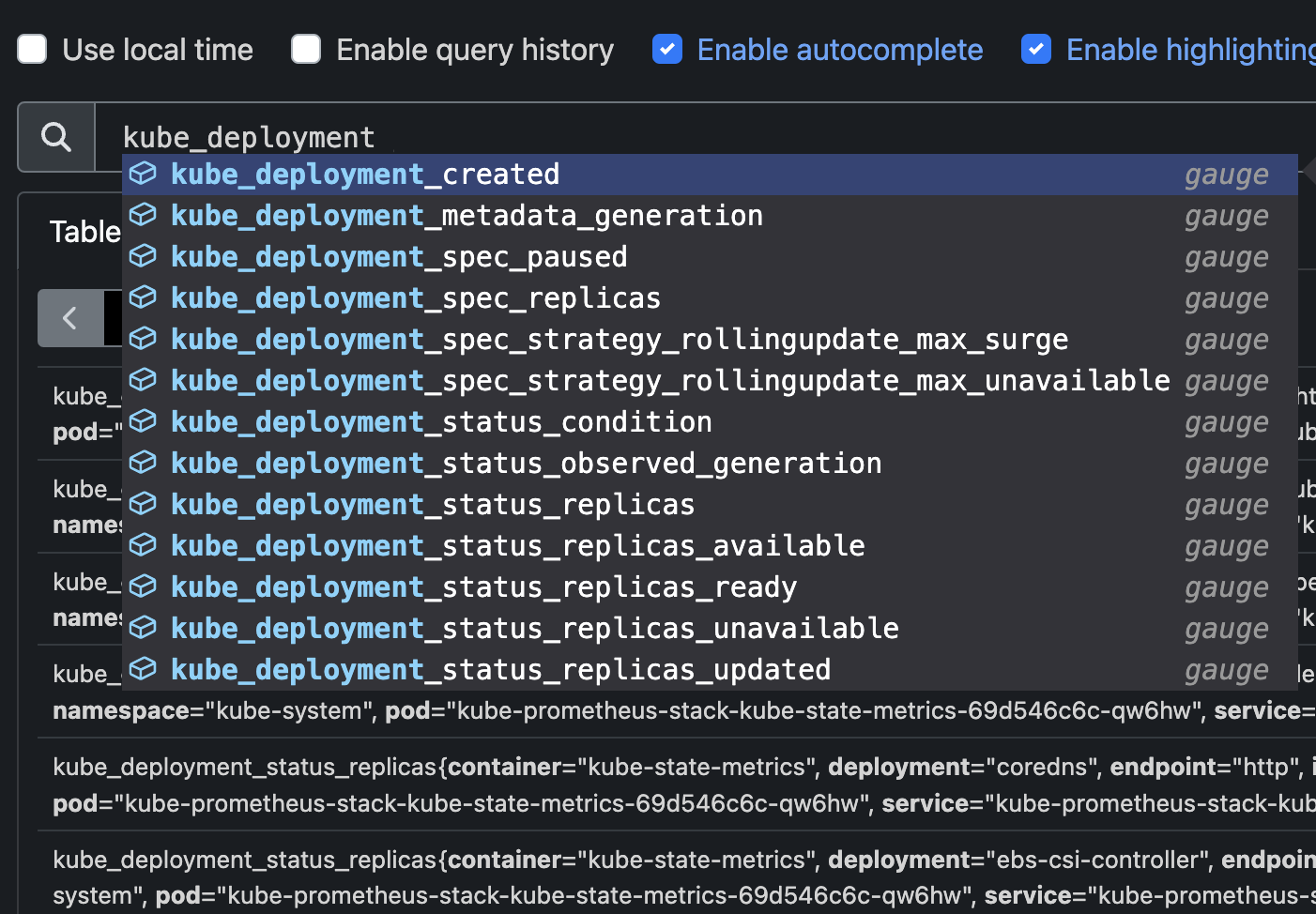 대표적으로 kube_deployment 입력시 나오는 값들이 kube-state-metirc 데이터입니다.