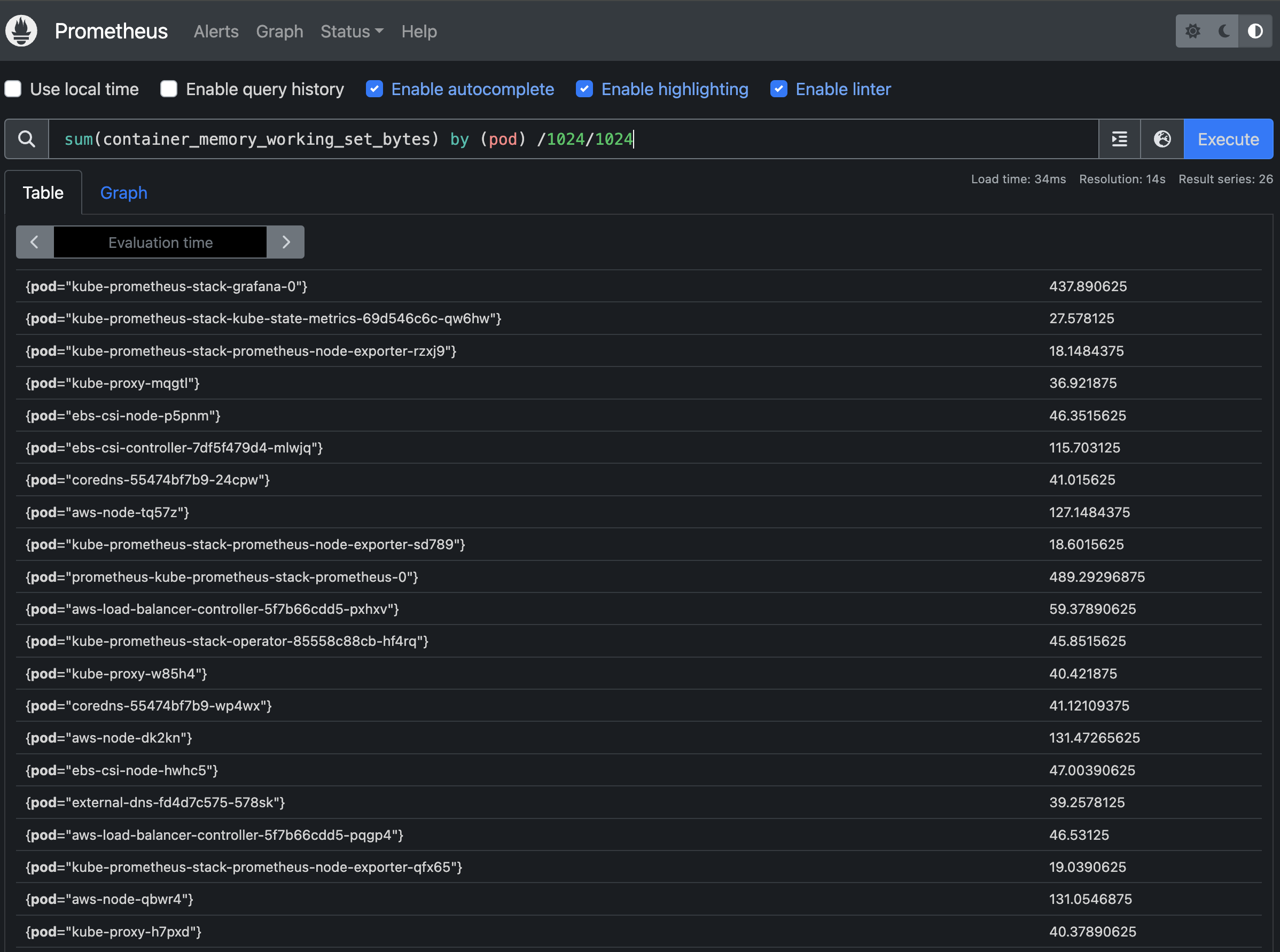 sum(container_memory_working_set_bytes) by (pod)/1024/1024